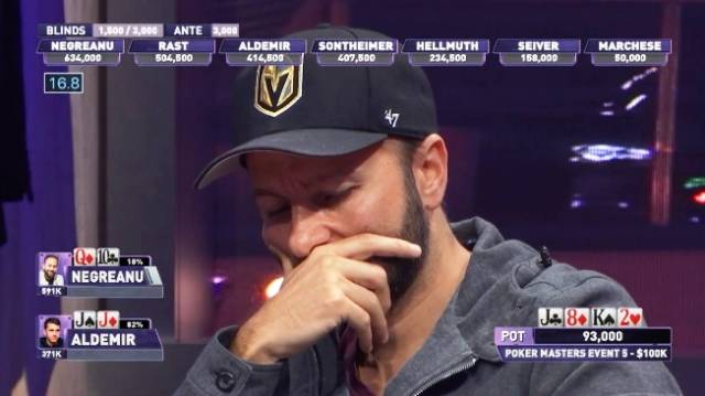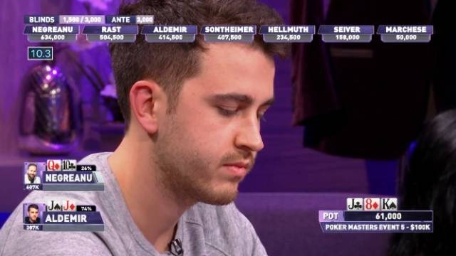 最后一场$100k锦标赛还剩16位选手,比赛距离奖励圈泡沫很近了。Negreanu和Aldemir都是桌上的大筹码,分别有筹码634,000和414,000。