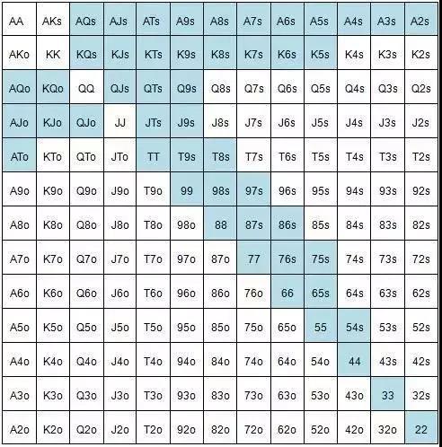 这也可以写为:{22+, A2s+, A2o+, K2s+, K8o+, Q2s+, Q9o+, J5s+, J9o+, T6s+, T9o, 96s+, 98o, 85s+, 87o, 74s+, 76o, 64s+, 76o, 64s+, 53s+, 43s}