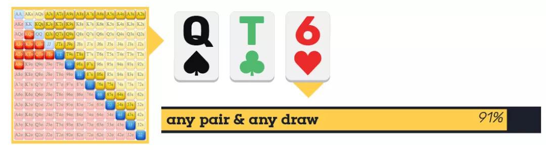 假设你认为对手翻前用约20%起手牌跟注你的翻前加注。这包括中小口袋对子、非同花大高张、同花连子、同花隔点连子(suited gapper)、同花Ax牌。如果翻牌是Q♠ T♣ 6♥,若你下注2/3底池,他会足够频繁地弃牌吗?