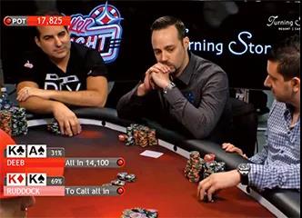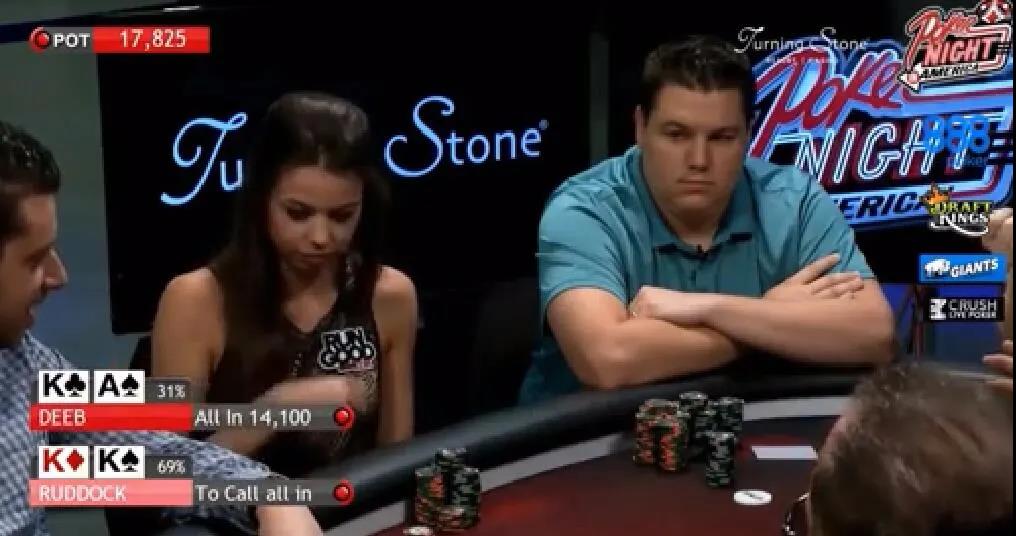 扑克新闻记者Steve Ruddock在参加《美国扑克之夜》节目时,曾打了一场$5000买入的25/50的无限注德州扑克,他当时在现场遇到了一个让他非常苦恼的局面——在和Shaun Deeb对战的时候,他拿到了口袋对K,但是在翻牌前不得不选择了弃牌。