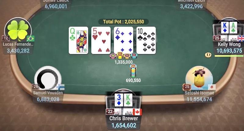 转牌圈发出一张T♠(T代表10)。Brewer往1335000的底池下注690550,Wong跟注。