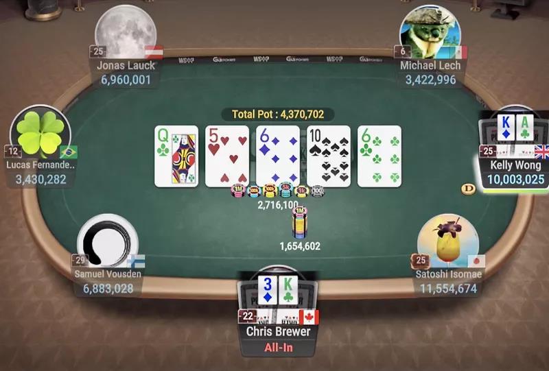 河牌是6♣。最终使公共牌面出现了对子,Brewer往2716100筹码的底池全压1654602筹码。Wong弃牌,Brewer用差牌拿下底池,在不摊牌情况下使筹码量增长了47%。