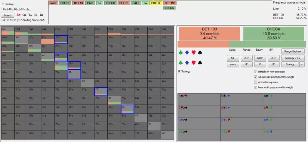 你可以看到solver会用一些口袋对(55、77、99)和一些底对(KTs、JTs、T9s)一定的频率下注。