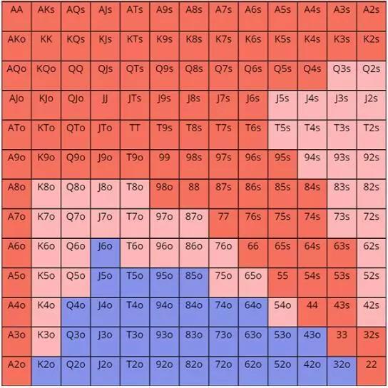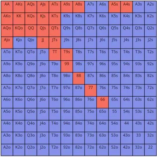 一个12%的率先加注范围可能是这个样子。红色代表加注,蓝色代表弃牌。