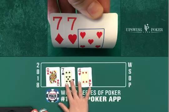 你用口袋对子77跟注一个巨大的再加注,焦急等待荷官发出翻牌……