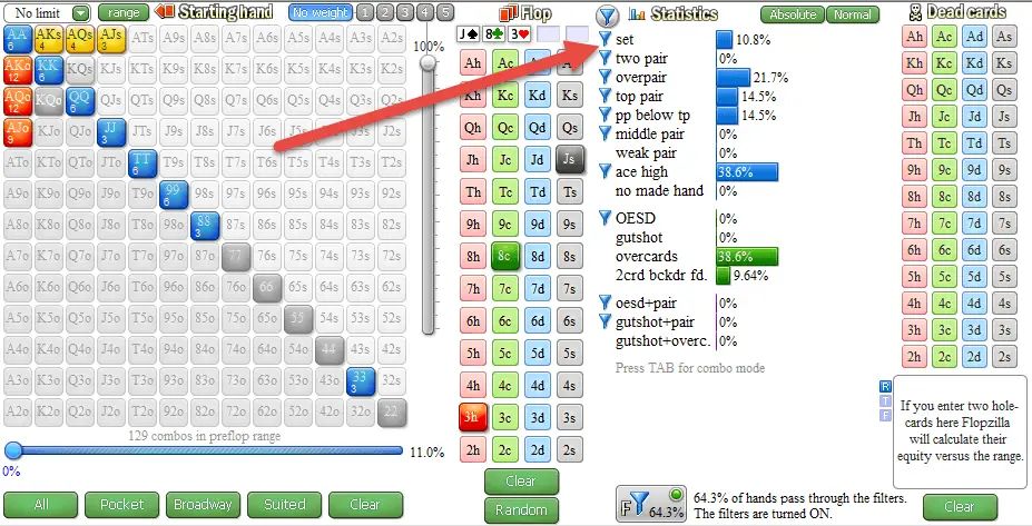 即使你缩紧持续下注范围(排除AK、AQ组合),并放宽继续游戏范围,使之包括高对,nit玩家仍然在48%的时候弃牌。