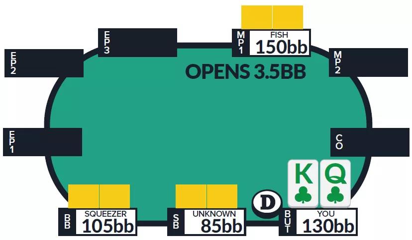有效筹码量35BB。鱼玩家在中间位置率先加注到3.5BB,你在CO位置拿着KQ。3-bet将使你陷入底池——即使你只3-bet到11BB,如果鱼玩家翻前全压,你也会得到不错的跟注价格。