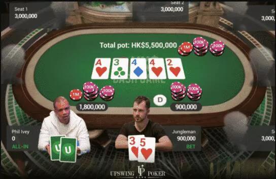最终,Ivey亮出口袋对4(翻牌圈暗三条,转牌圈四条)。Jungleman亮出他的同花顺,赢得了一个高达640万港币的底池。