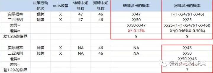 Y=X*-0.17%,当Outs不大于7的时候,转牌用二四法则计算下一条街成牌概率的与实际差异不超过1.2%。