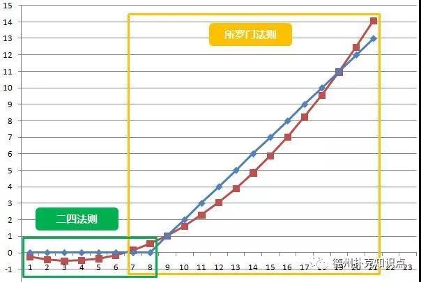 这里就引入了所罗门法则所增加的修正项(X-8)*1%——当X大于等于9的时候,Y’=(X-8)*1%就是倾斜向上的蓝色折线这一段;