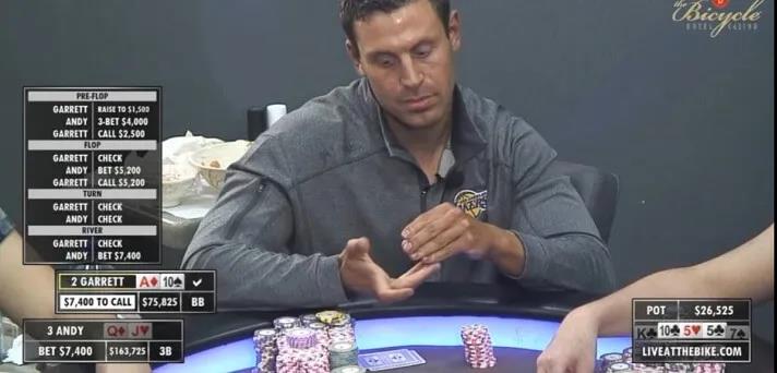 Garrett思考了近2.5分钟,最终决定跟注。Andy直接Muck(盖牌),Garrett赢得了33,925的漂亮彩池。