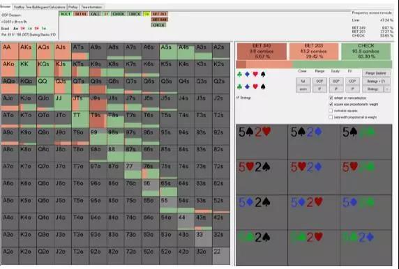 Pio的诈唬边界牌是55。Pio对55采用诈唬和check混杂的策略。Pio用所有比55差的牌诈唬,用边缘/良好摊牌价值牌(66-AT)check,用AJ及更好牌价值下注。