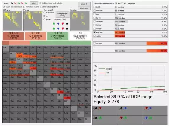 我们看看理想情况下我们用多少空气牌(K高及更差牌)下注。范围探索者(Range Explorer)表明,我们用69%的空气牌check,而用剩余空气牌诈唬: