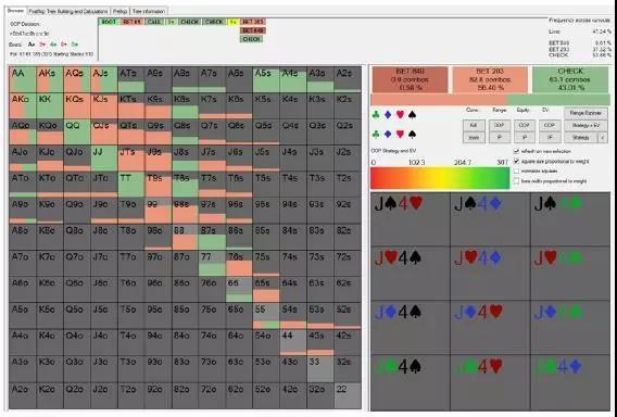 首先我们计算Pio中的最优均衡。以下是按钮玩家对抗我们最优2/3底池下注范围的最优河牌圈跟注范围: