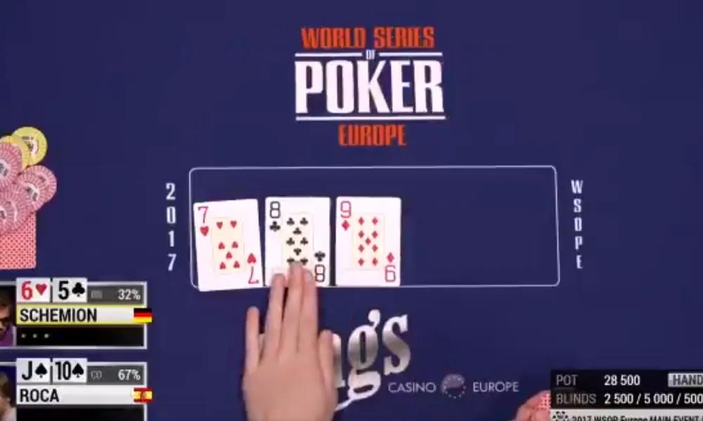 在那种翻牌是连牌面,或者只是隔一张的连牌面中,如果转牌与河牌没有出现第四张连牌,那这一招也是适用的,所以如果翻牌8-7-6,你下注了,转牌是3,河牌是Q的话,那就继续放心诈吧。